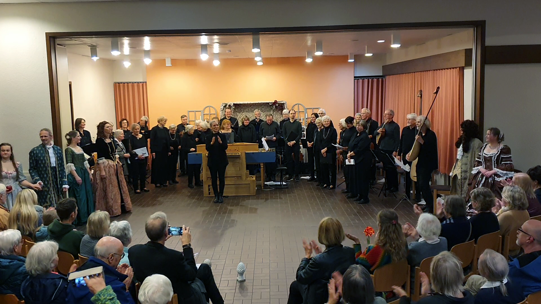 Zur Freude der Mitglieder des „Embiscara Consorts“ war das Konzert am 27. Oktober im Dietrich Bonhoeffer Haus so gut besucht, dass Stühle hinzu gestellt werden mussten. Thema des Konzerts war englische Musik des 17. Und 18. Jahrhunderts. Eröffnet wurde es mit dem fünfstimmigen „Laudate Domino“ von Thomas Tallis, bei dem Musikerinnen und Musiker des Ensembles neben den Instrumental- auch die Gesangsstimmen übernahmen. Es kam Instrumentalmusik bekannter und weniger bekannter Komponisten des englischen Barock zur Aufführung. Die siebenköpfige Tanzgruppe tanzte zu Musik, die für die zwischen den Opernszenen damals üblichen Balletteinlagen bestimmt war. In kurzen Sprech- und Spielszenen wurde das Publikum in das Thema der nachfolgenden Arien eingeführt, die gefühlvoll und humorvoll von Bettina Oschmann vorgetragen wurden. Wie oft in barocken Opern, ging es um Liebeshändel zwischen antiken Göttern und Nymphen. Ada Tanir, die künstlerische Leiterin des Consorts, war die Solistin des Cembalokonzerts Op.1 No.6 von Johann Christian Bach, dem „Londoner Bach“. Der hatte sich mit diesem frühen Werk geschickt in die englische Gesellschaft eingeführt, indem er den letzten Satz als Variationen über die britische Nationalhymne „God save the King“ gestaltete. Das Publikum dankte den Aufführenden des gut einstündigen Konzerts mit kräftigem Applaus und erhielt dafür als Zugabe eine getanzte und musizierte Chaconne von Henry Purcell.